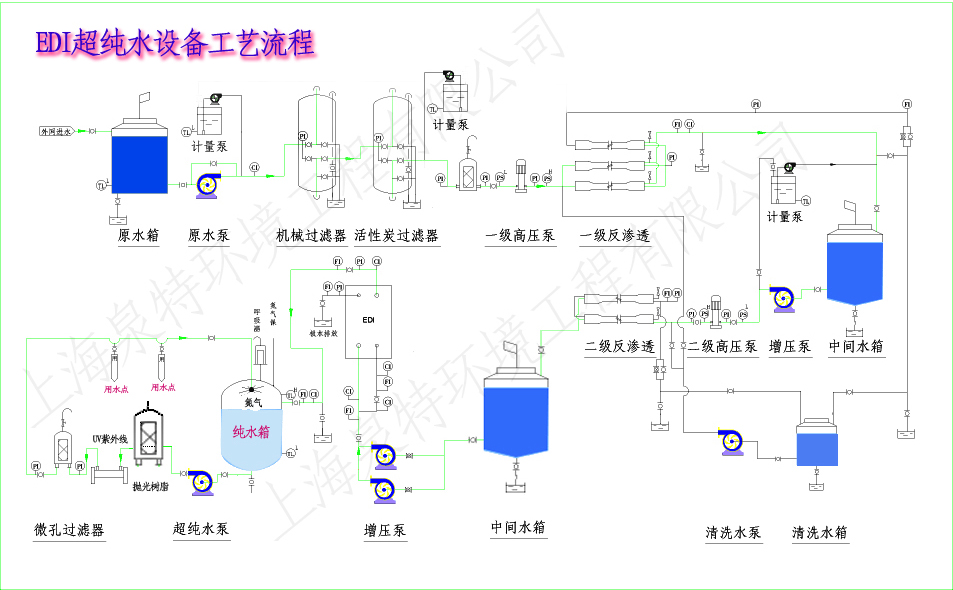 上海泉特环境工程有限公司为满足对水质有特殊要求(电阻值大于15MΩ.CM)的用户需要,采用多级预处理+二级RO膜分离+EDI精除盐+抛光MB工艺综合处理达到符合标准(超纯水)的水质。